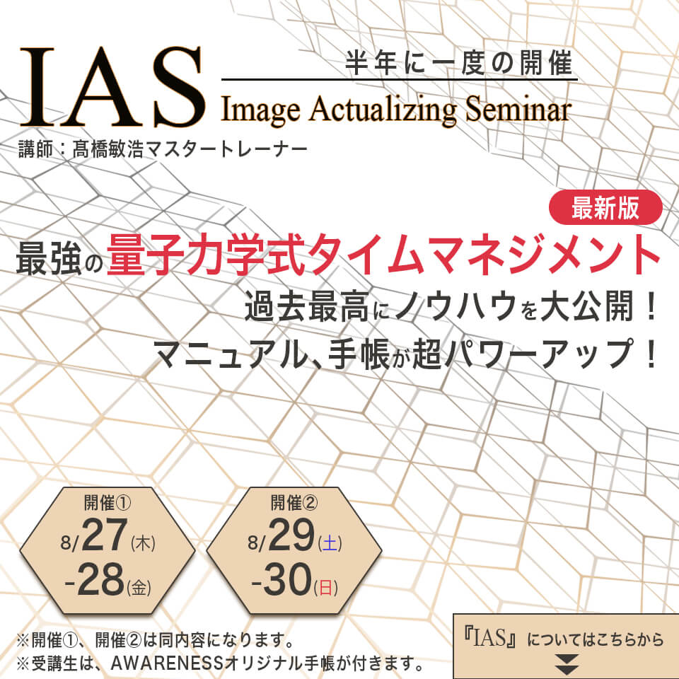 8月27~28日、8月29~30日に2回の開催を予定している『IAS』では、2日間を通して「量子力学式タイムマネジメント」を学ぶことができます。
