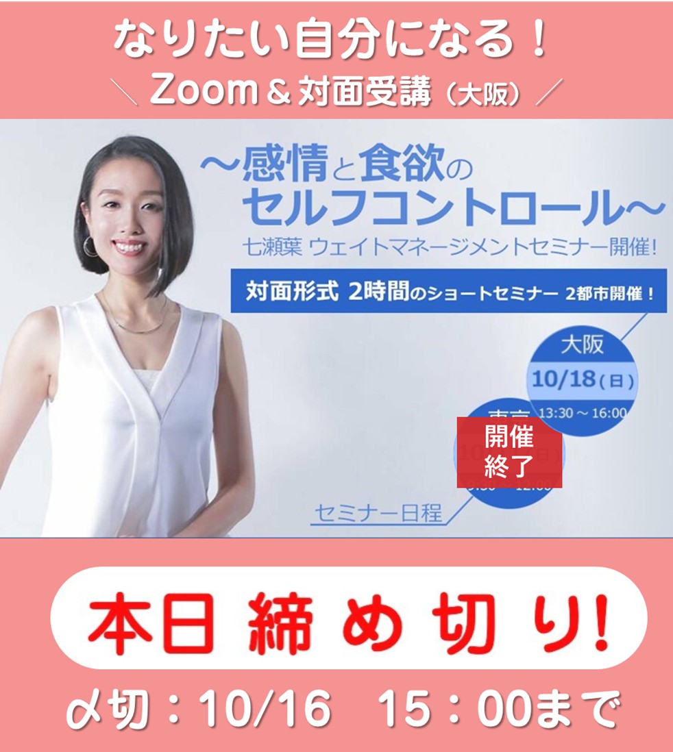 〈本日15時まで!〉『七瀬葉ウェイトマネジメントセミナー』~感情と食欲のセルフコントロール ~申込期限のお知らせです