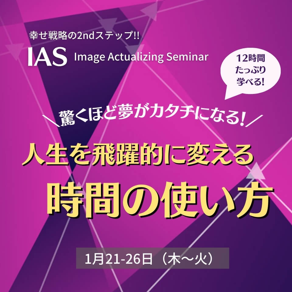 お申込み忘れはありませんか?最新収録映像オンライン配信!驚くほど夢がカタチになる!人生を飛躍的に変える時間の使い方『1/21~26 IAS』