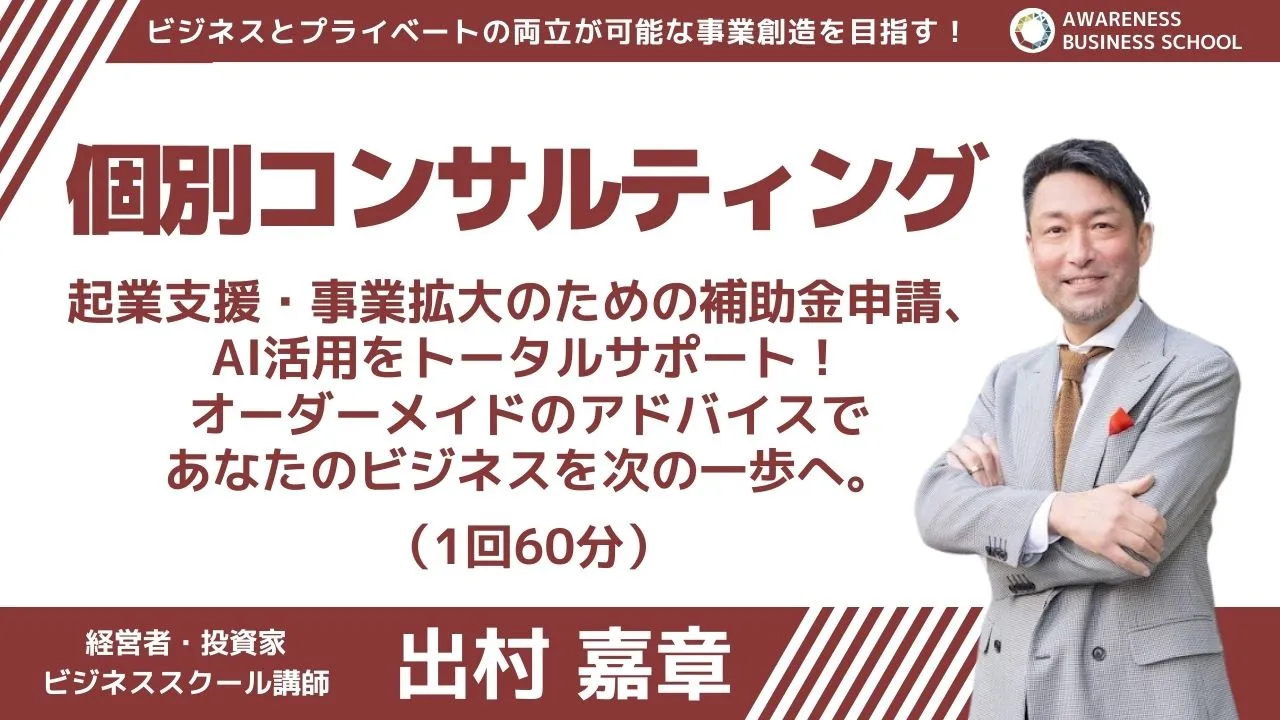 独立開業後、事業を13年間黒字経営され認定コーチでもある実績ある出村 嘉章 講師から、個別コンサルティングを通して実際に起業支援、補助金、助成金支援を行い徹底伴走をし、あなたにあったアドバイス、サポートをしてくださいます。