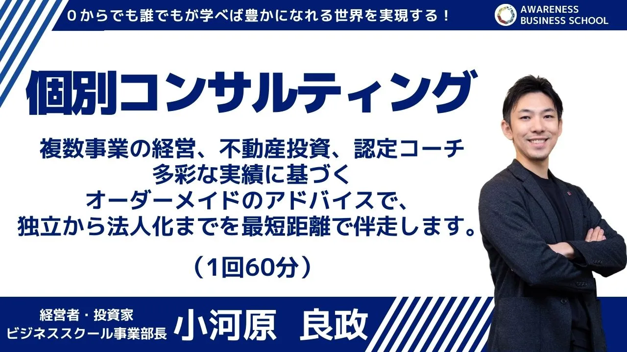 サラリーマンから、独立し、複数事業を経営され不動産オーナーかつ、認定コーチでもある実績ある小河原良政講師から、個別コンサルティングを通して実際に法人化までの伴走をあなたにあったアドバイス、サポートをしてくださいます。