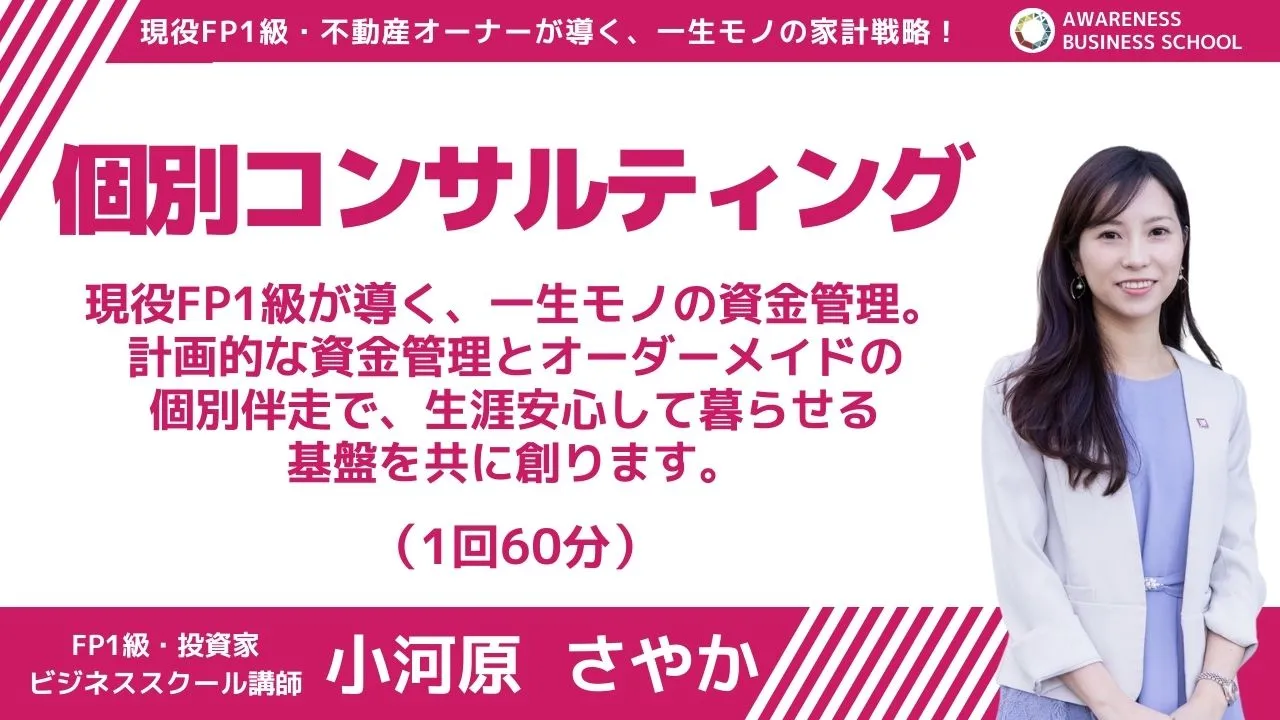 本コンサルティングではサラリーマンから、独立、現在、不動産オーナーであり、ファイナンシャルプランナー1級である小河原さやか講師から、別コンサルティングを通してお一人お一人に合わせた個別のアドバイス、サポートをしてくださいます。