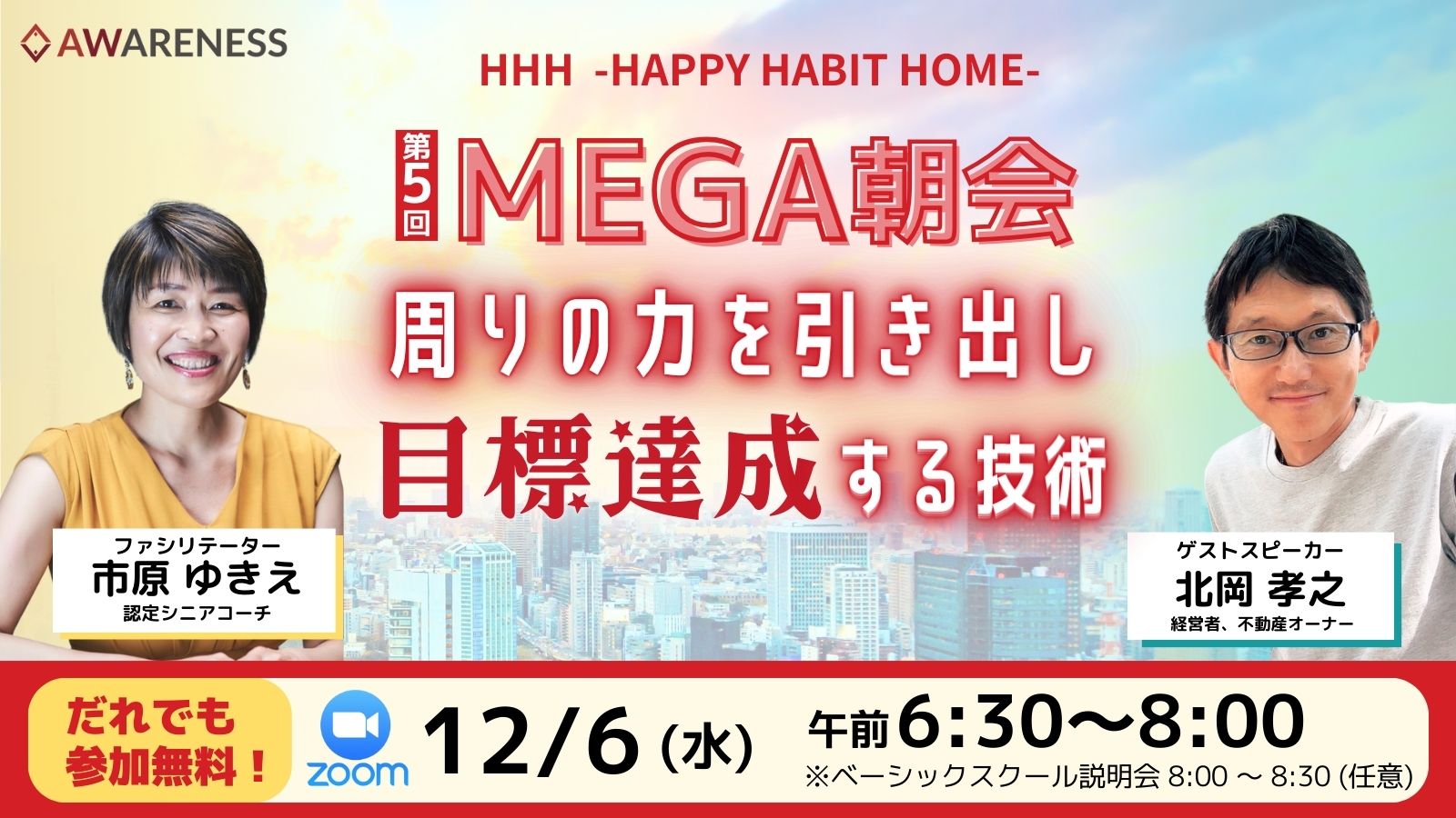 12月06日(水) 06:30~08:00 申込期限:12月6日(水)5:30まで ※自由参加:会の終了後(8:00~8:30)、学びを習慣化する「ベーシックスクール」の説明会を実施します |