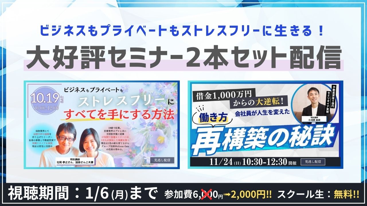 12月17日(火)~01月06日(月) 09:30~23:59 申込期限:1月5日(日)23:59まで 申込みは1月5日(日)まで可能ですが、視聴期限は変わらず上に記載の期限までとなります。 ※有料の方はスムーズにご視聴いただくためにも、クレジットカード決済を推奨いたします。(12/27~1/5の間は冬季休業につき、銀行振込でご入金された場合は休み明けの対応になります事、予めご了承ください) |