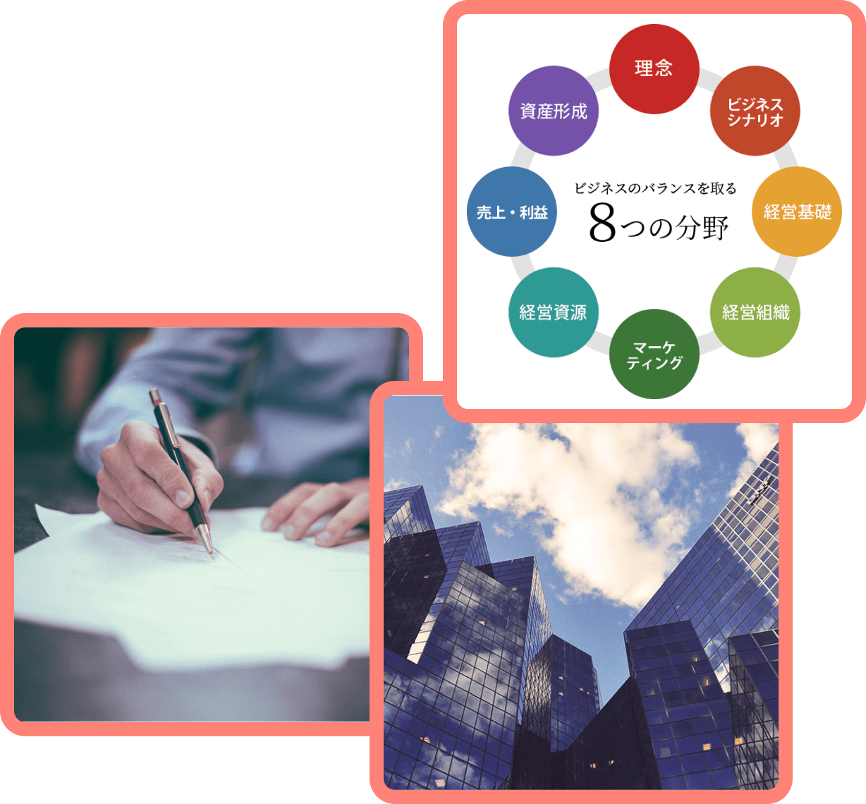 理念、ビジネスシナリオ、経営基礎、経営組織、マーケティング、経営資源、売上・利益、資産形成。